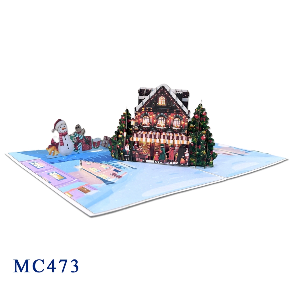 When opened, the card reveals a charming Christmas house pop-up scene: a cozy winter shop surrounded by Christmas trees, Santa Claus, a snowman, and families sharing festive cheer. This detailed laser-cut pop-up card is a wonderful keepsake that brings the holiday spirit to life.