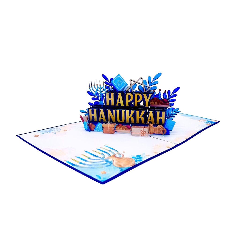 Once opened, the card reveals a vibrant 3D “Happy Hanukkah” centerpiece, beautifully decorated with menorahs, dreidels, gifts, and festive leaves in shades of blue and gold. It’s the perfect card to share blessings and joy with family and friends during Hanukkah.