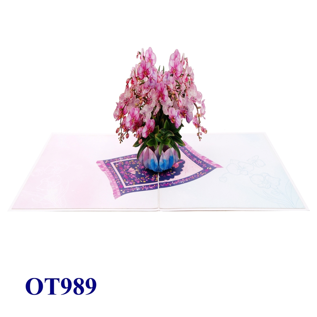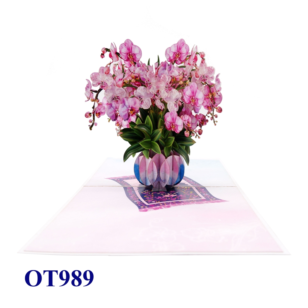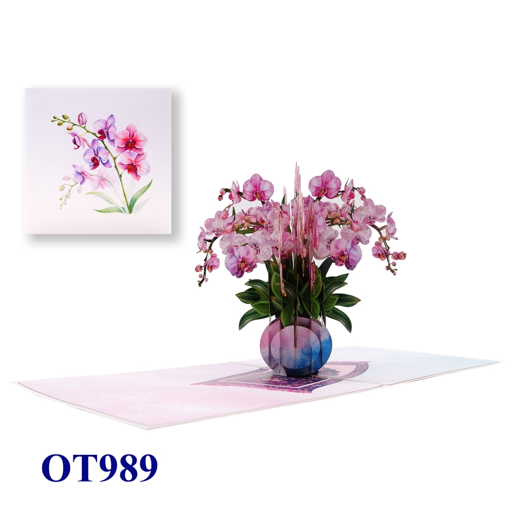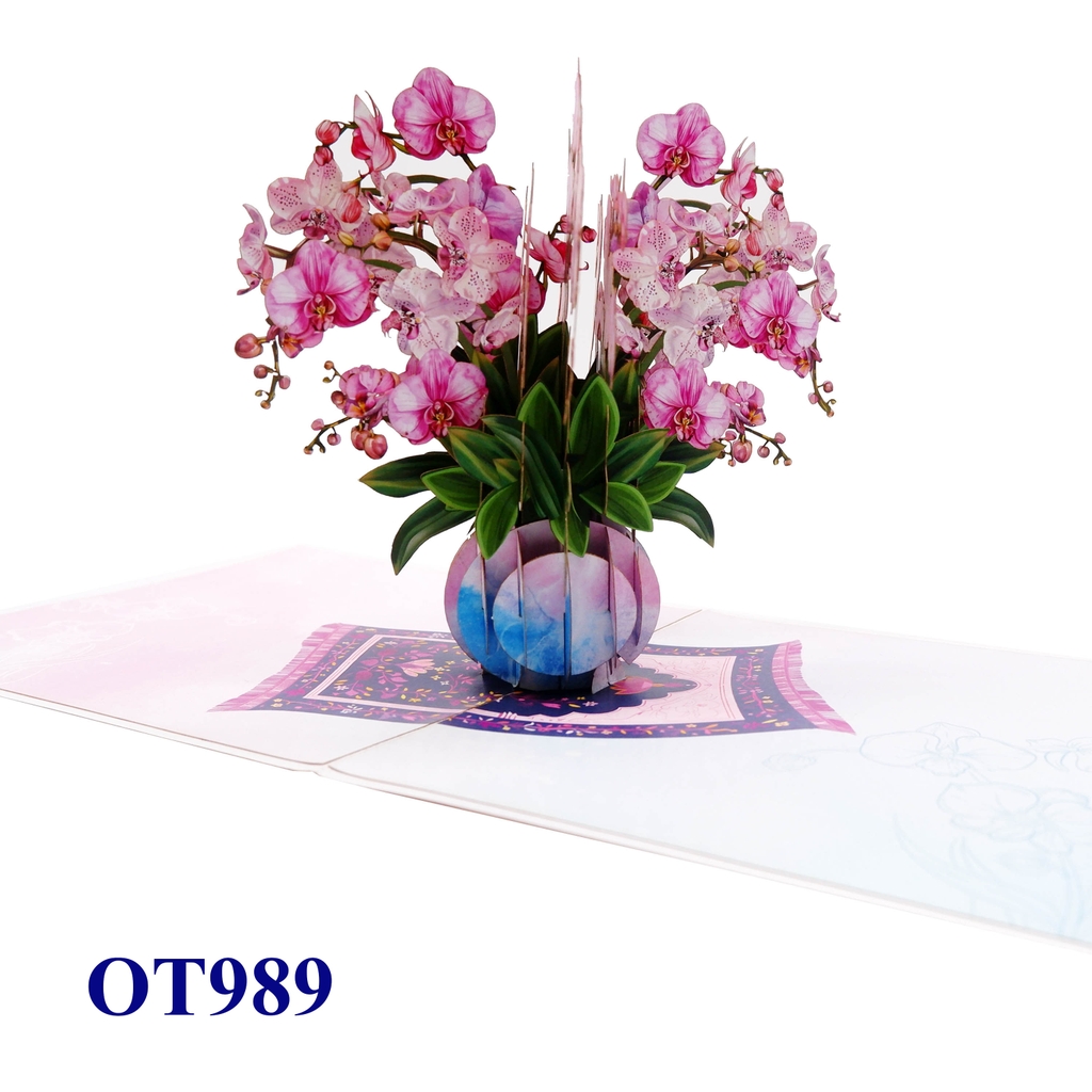 This exquisite orchid pop-up card features a vibrant blooming bouquet that unfolds gracefully when opened, creating a stunning visual centerpiece. The detailed 3D petals, soft pink tones, and elegant round vase give the design a refined and captivating look. Each element is precisely laser-cut and hand-assembled by Viet-Craft, a trusted handmade cards supplier in Vietnam known for its premium pop-up cards and meticulous craftsmanship.
